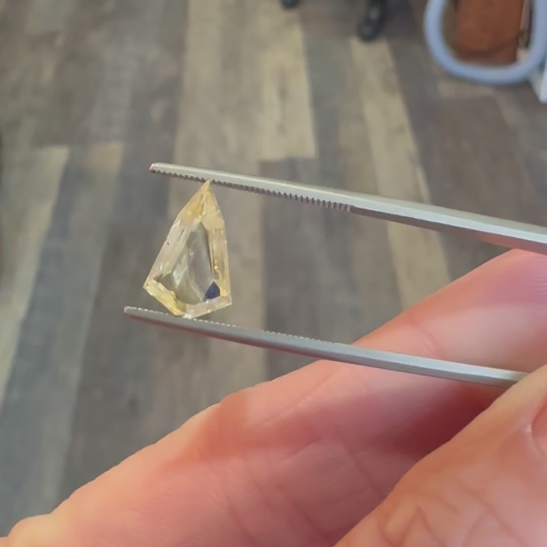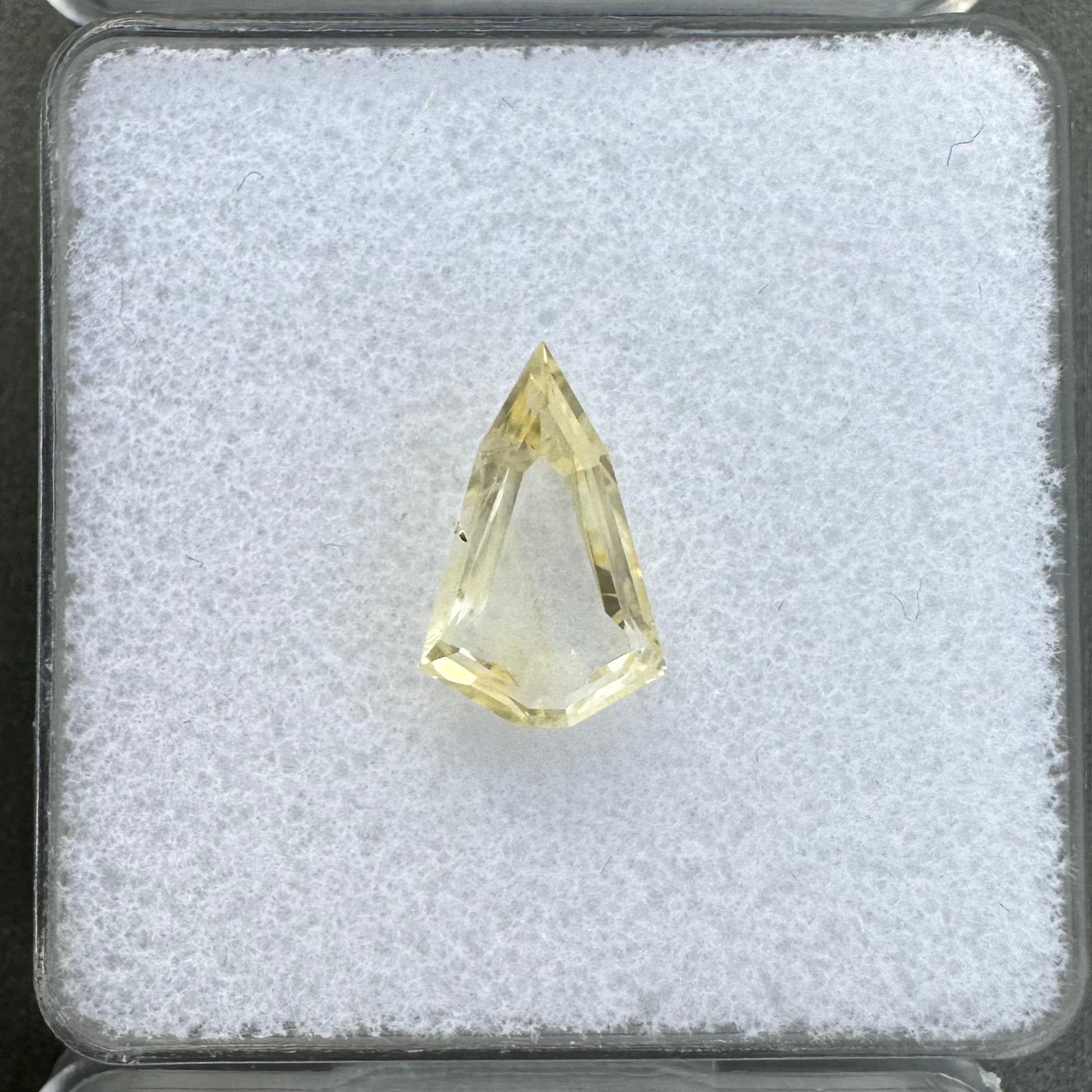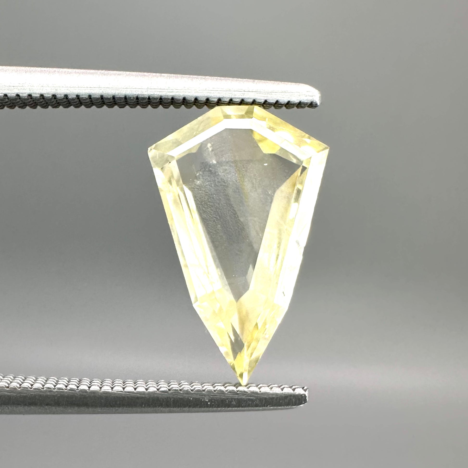 Aegis, named for the shield carried by Zeus and Athena in Greek mythology, is a one-of-a-kind shield-shaped portrait cut yellow sapphire from Sri Lanka.