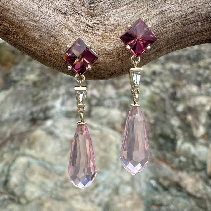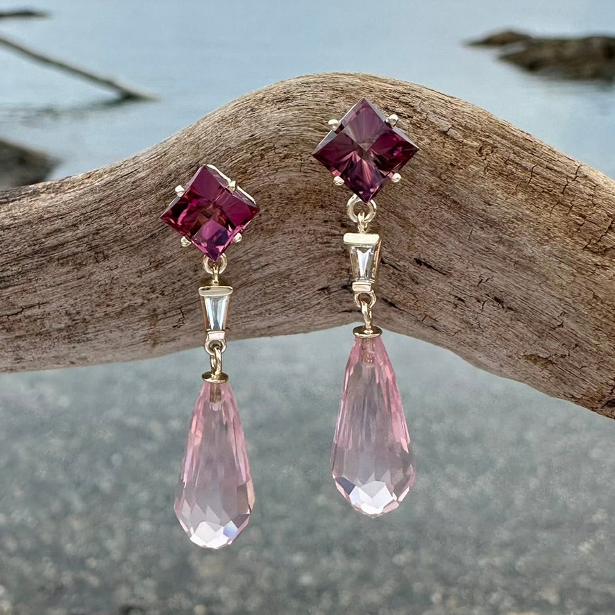Bryer dangles begin with rich, deep pink, sharp-edged rubelite tourmalines, hand cut in Idar Oberstein, Germany and set in 14k gold. Tapered diamond baguettes connect them to blush pink rose quartz briolette dangles from Madagascar.