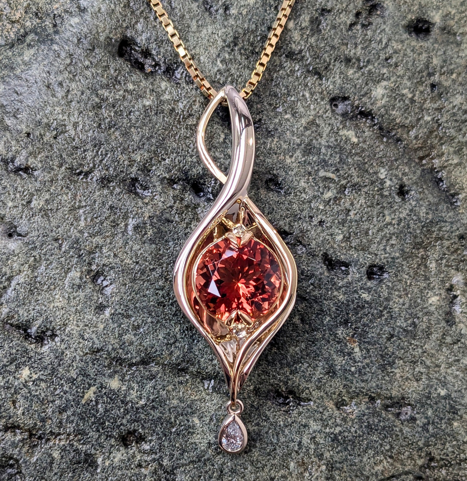 This elegant two-toned pendant was named for the Calla Lilly whose shape it mirrors and its creator Mary Elizabeth's deep love of music. It features a 3.36ct Oregon Sunstone (cut locally by Greg Brancati) set in 18k white and yellow gold and finished with a tiny diamond dewdrop (.09ct, VS F/G).