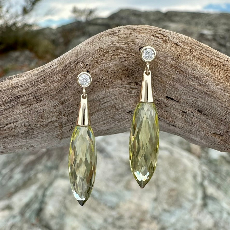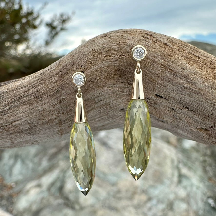 A delicious set of dangle earrings, featuring pale yellow lemon quartz briolettes topped with tiny bezel set diamonds in 14k yellow gold.