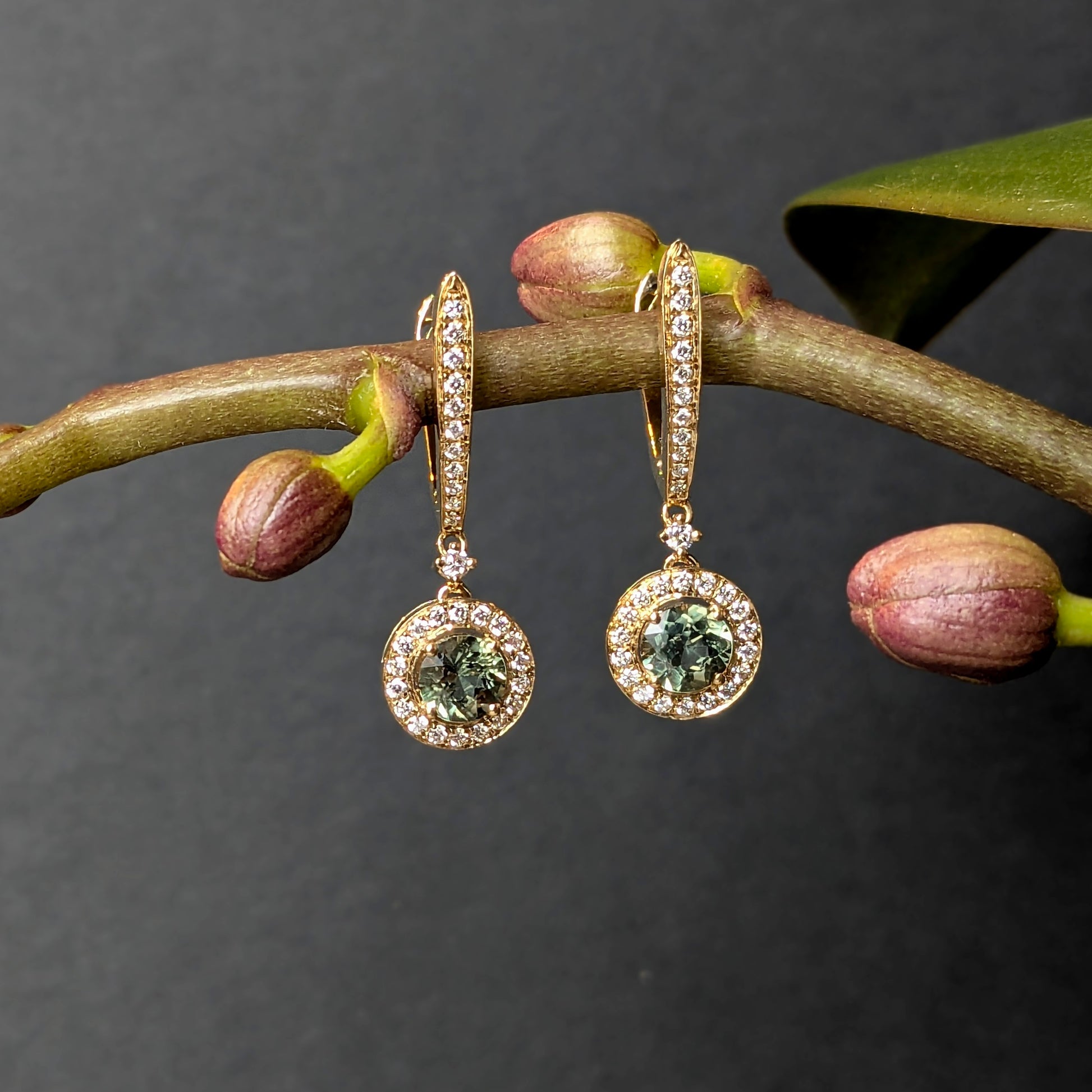 These luminescent sapphire and diamond dangle earrings by Michael Couch had just too much sparkle for us to pass up! They feature two succulent green sapphires (1.23tcw) set in 14k yellow gold, and a halo of tiny diamonds (.39tdw, VS E/F) that orbit the sapphires in glitter and climb the lever-back posts.
