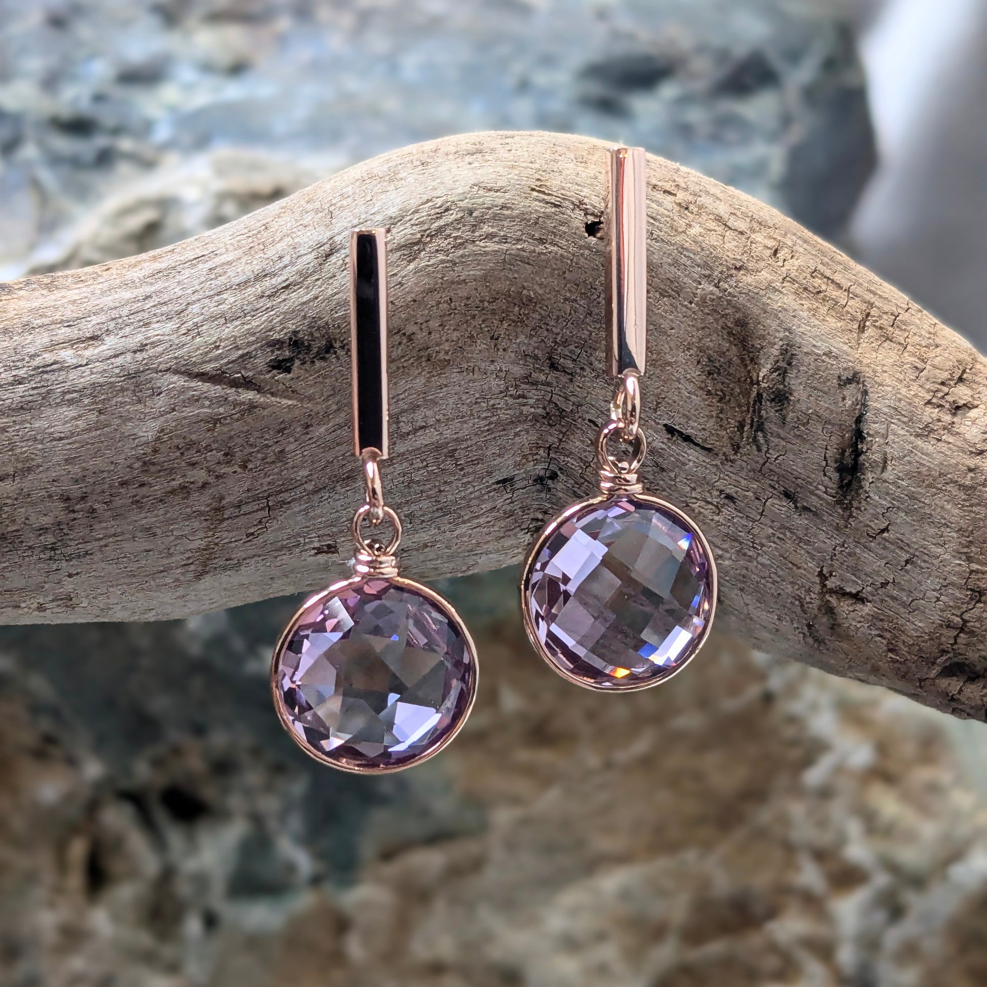 Soft purples and pinks gentle the geometric edges of these beautiful dangle earrings like the Louvre Pyramid seen at a rainy dusk. They feature 10mm Capri cut Rose de France gems bezel set in 14k rose gold and hung on 14k rose gold posts.